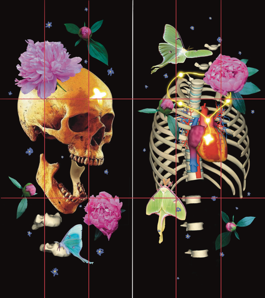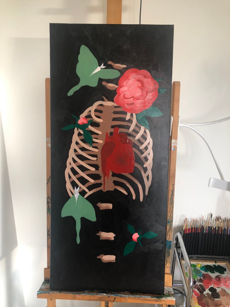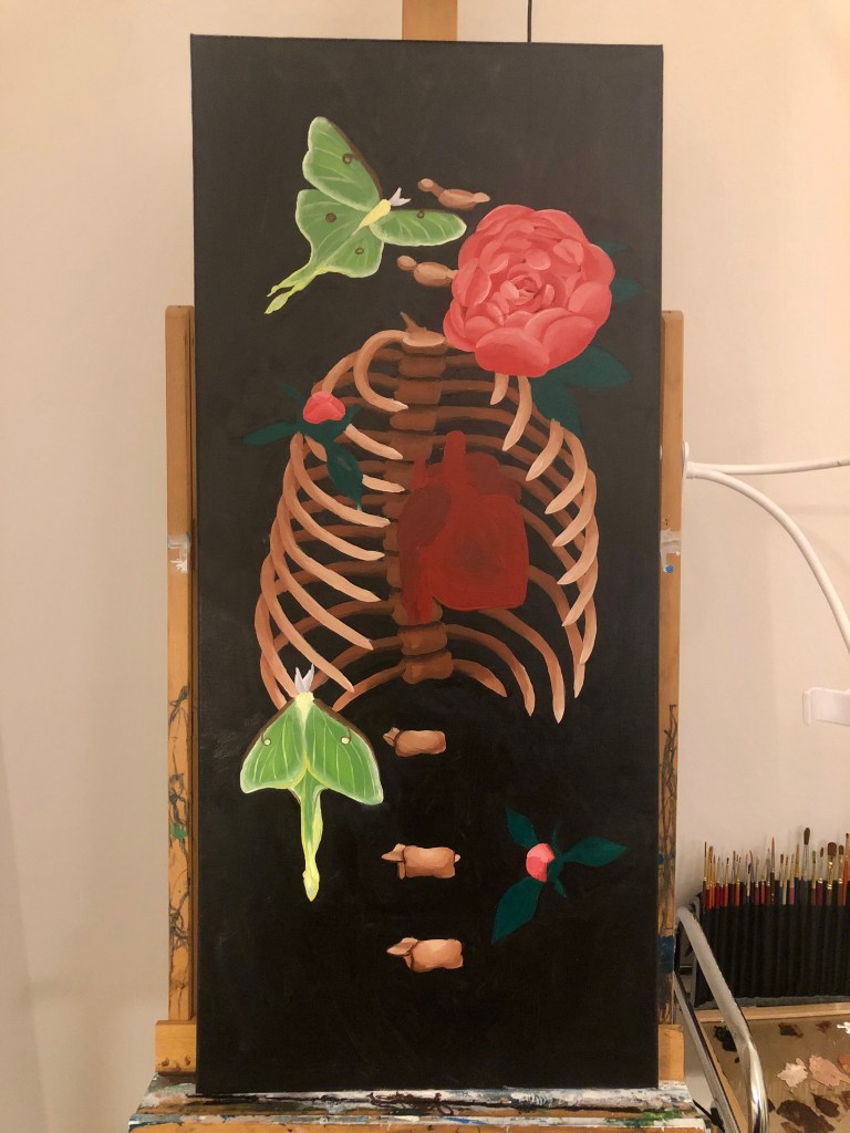I take photos of beautiful flowers whenever I see them because you never know when it can be fit into a painting! I was not able to find a reference photo of the ribcage at the perfect angle so I ended up using an anatomical app which allowed me to pose the skeleton structures myself. The app is called 3D Anatomy Learning (Apple store, Google play), and as of January 2023 it is free. I will definitely be using this app again!