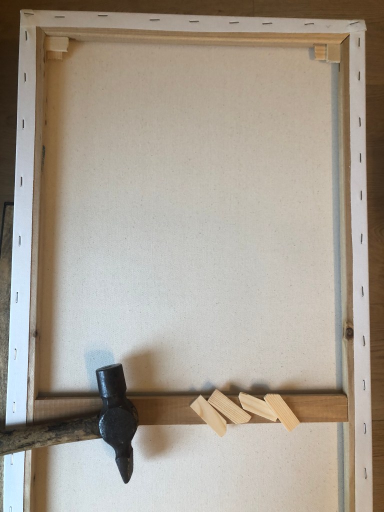 The first thing to do with premade canvas is to complete the stretch of the fabric. The tiny pieces of wood that come with canvases from the art store are there for a purpose – to hammer into the edges of the wooden frame. This tightens the fabric, so that it is less bouncy and flimsy while painting.