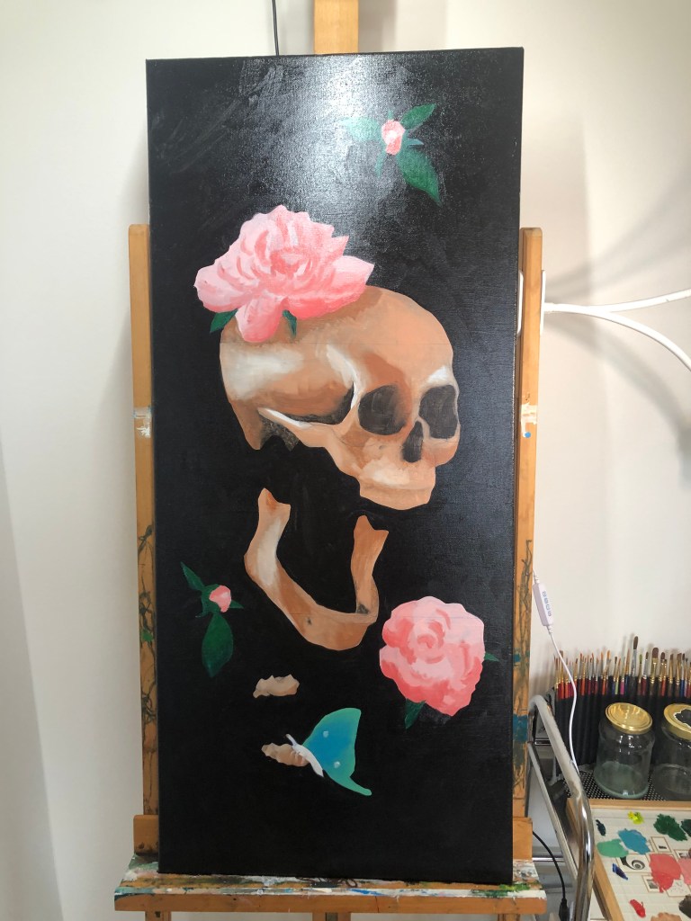 I thought it might be fun to walk through all the steps to my latest paintings – two tall canvases fully inspired by memento mori and remembering that everyone dies (even religion can’t save you from ending up 6 feet under).