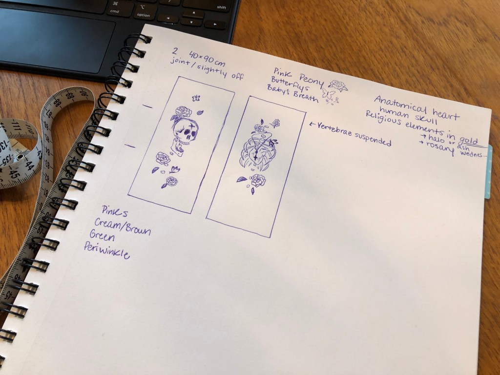 Having two ideas and lots of white walls to cover, I ended up deciding on completing two canvases which compliment one another. When planning items out, I prefer to use my sketchbook as a planner with directions for future me. I usually use both drawings and words to keep track of the idea, being both a writer and artist I try to use both to my advantage when needed.