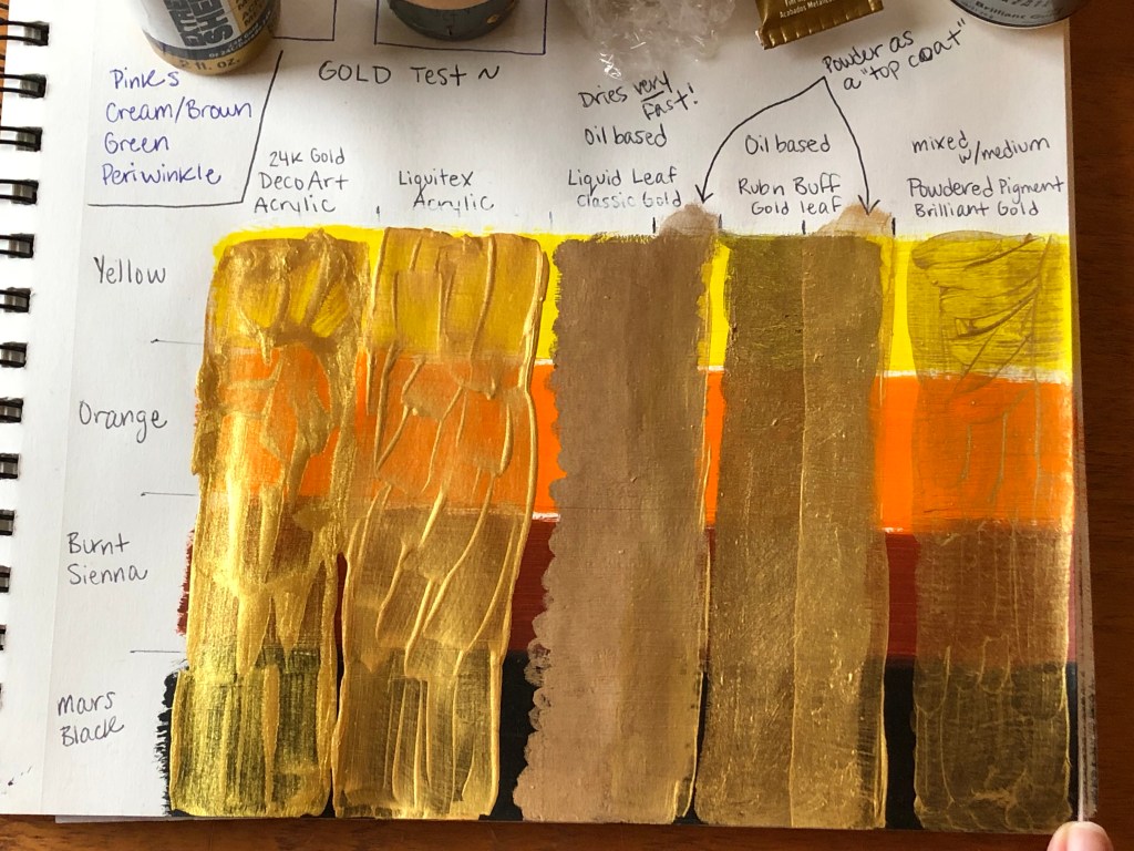 Another great advantage of using the sketchbook to plan is that you can test out new products and colors. I knew I wanted to use gold, for the more religious parts like the ash cross and rosary beads, though I haven’t used gold for oil paints before. Therefore, it was a perfect opportunity to test out the all the golds I had with different base colors.