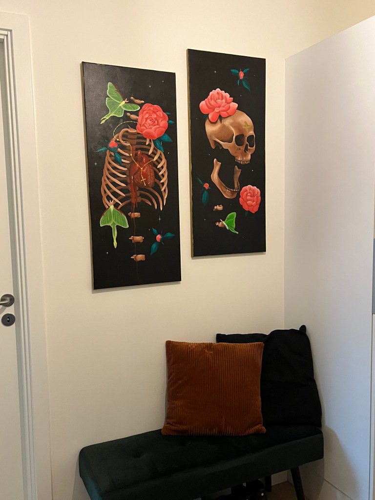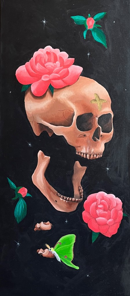 I usually get a lot of inspiration for painting from music, but this time I was more focused on needing to furnish and decorate my new apartment. My white walls were begging for some dark colors! Memento mori is a huge component of my creativity, so naturally I needed to fill up these white walls with some skulls.